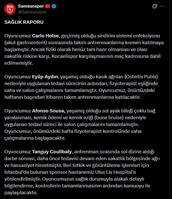 Samsunspor, sanal medya hesaplarından takımda forma giyen Carlo Holse, Eyüp Aydın, Afonso Sousa ve Tanguy Coulibaly’nin sakatlık durumu hakkında açıklamalarda bulundu. Yapılan bilgilendirmede; Holse’nin sindirim sistemi rahatsızlığı, Eyüp Aydın’ın kasık ağrıları, Sousa’nın sol ayak bileğinde çoklu bağ yaralanması ve Coulibaly’nin antrenman sırasında sol dizine aldığı darbe bilgileri paylaşıldı.