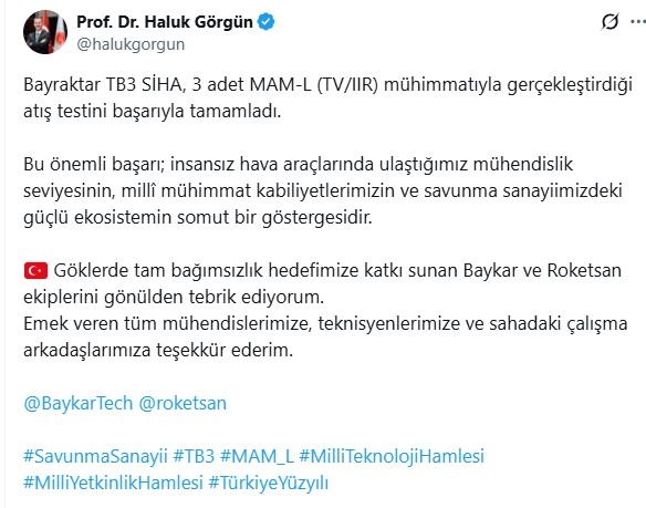 Savunma Sanayii Başkanı Haluk Görgün, sosyal medya hesabından yaptığı paylaşımda, "Bayraktar TB3 SİHA, 3 adet MAM-L (TV/IIR) mühimmatıyla gerçekleştirdiği atış testini başarıyla tamamladı. Bu önemli başarı; insansız hava araçlarında ulaştığımız mühendislik seviyesinin, milli mühimmat kabiliyetlerimizin ve savunma sanayiimizdeki güçlü ekosistemin somut bir göstergesidir. Göklerde tam bağımsızlık hedefimize katkı sunan Baykar ve Roketsan ekiplerini gönülden tebrik ediyorum. Emek veren tüm mühendislerimize, teknisyenlerimize ve sahadaki çalışma arkadaşlarımıza teşekkür ederim" ifadelerini kullandı. (DHA)