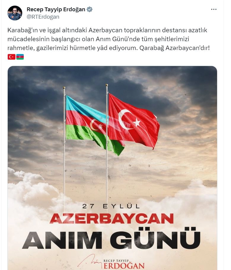 ANKARA, (DHA)- CUMHURBAŞKANI Recep Tayyip Erdoğan, Azerbaycan'ın 'Anım Günü'nde tüm şehitleri rahmetle andı. Cumhurbaşkanı Erdoğan, sosyal medya hesabından yayımladığı mesajda, "Karabağ'ın ve işgal altındaki Azerbaycan topraklarının destansı azatlık mücadelesinin başlangıcı olan Anım Günü'nde tüm şehitlerimizi rahmetle, gazilerimizi hürmetle yad ediyorum. Qarabağ Azerbaycan'dır" ifadelerini kullandı. (DHA) FOTOĞRAFLI